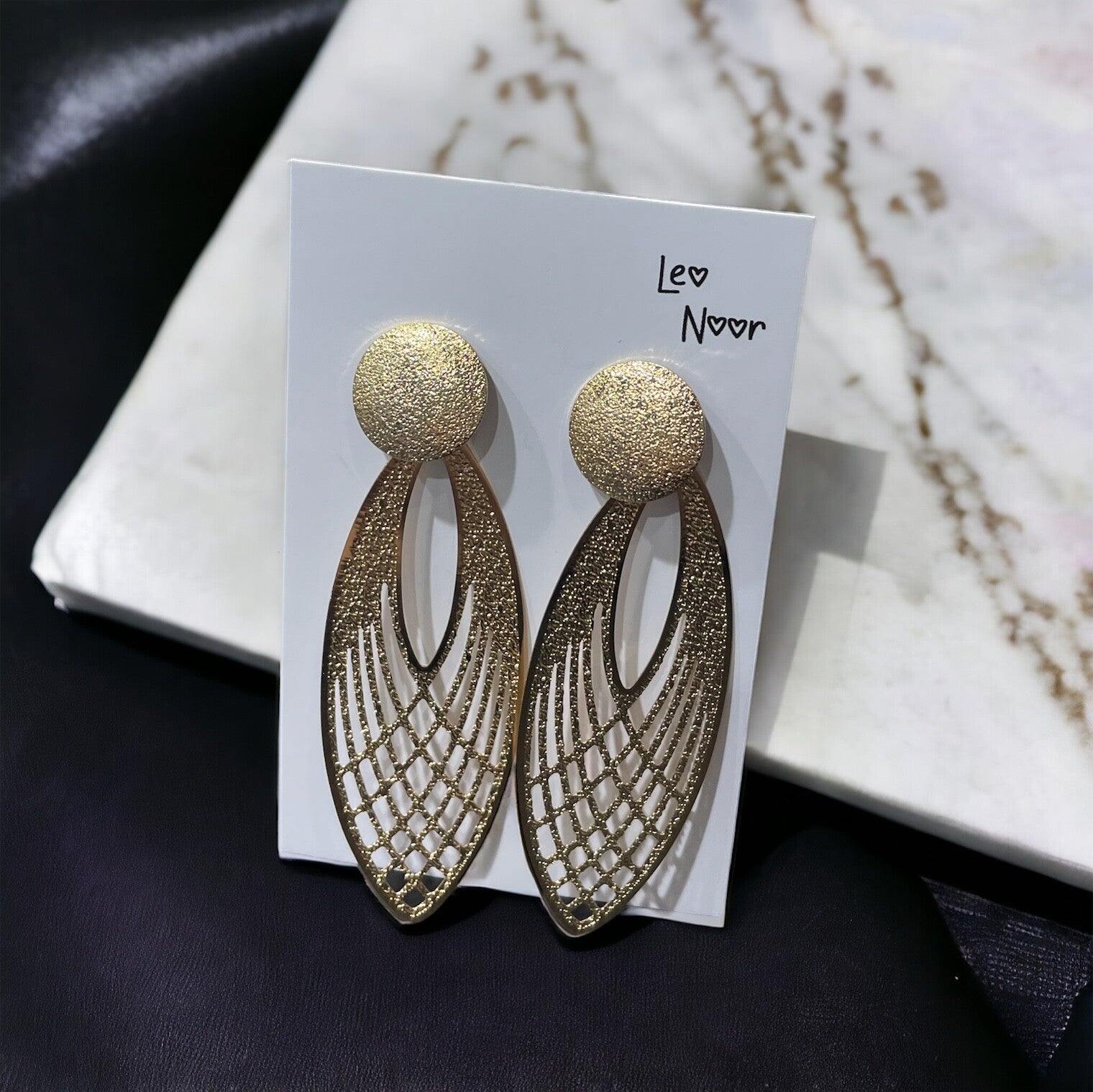 Ellipsvormige goudkleurige oorbellen met kleine glitter.