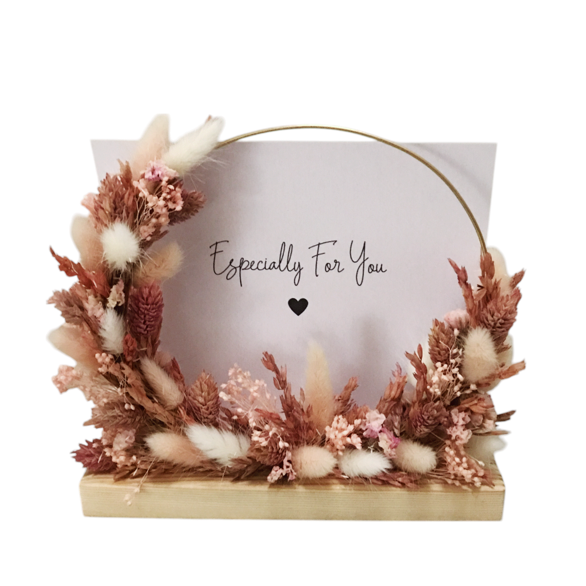 Flowerhoop met zorgvuldig geselecteerde droogbloemen. Voorzien van een handig gleufje aan de achterkant om een foto of kaartje in te plaatsen. Verpakt in een stijlvolle mica doos perfect als cadeau of om je interieur op te fleuren!